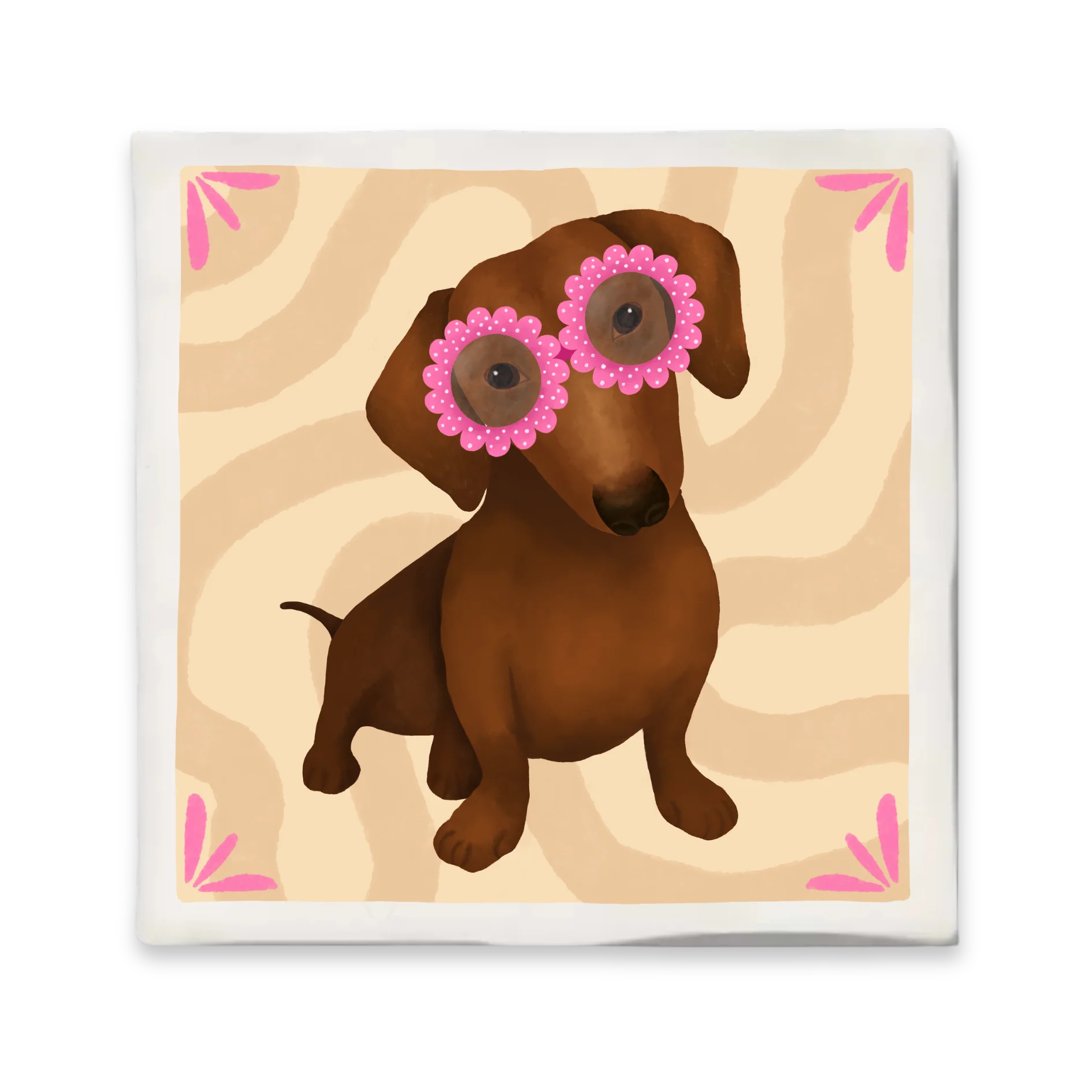 Een teckel met een eigen stijl! Dit tegeltje toont een bruine teckel met opvallende roze bloemen zonnebril tegen een speelse achtergrond. Leuk voor hondenliefhebbers of als vrolijke toevoeging aan je interieur. Perfect als cadeau of om zelf te houden.