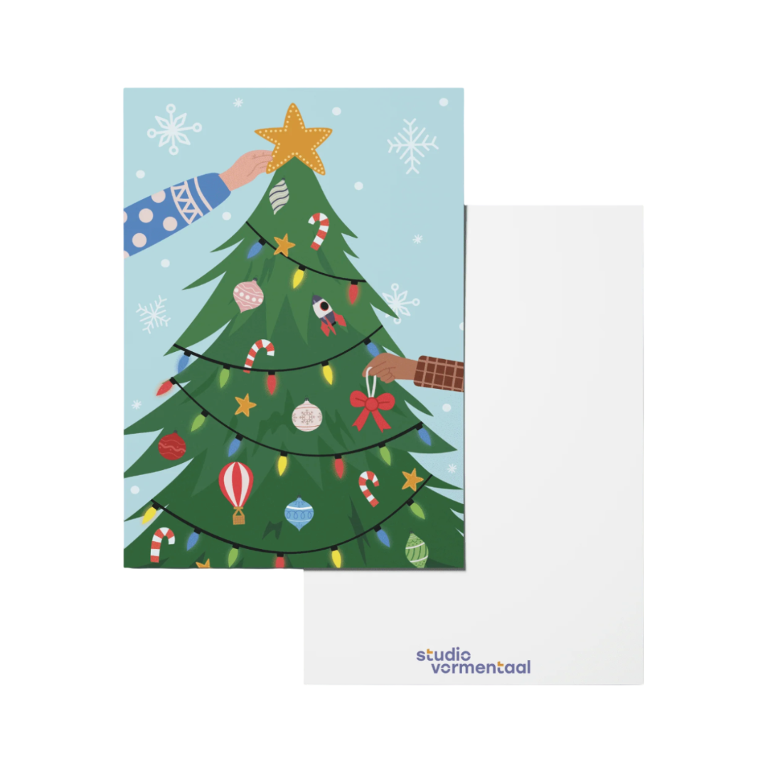 Breng de magie van kerst tot leven met deze sfeervolle kerstkaart! Met een feestelijke illustratie van een versierde kerstboom, compleet met sprankelende lichtjes en een ster die net op de top wordt geplaatst, straalt deze kaart gezelligheid uit. De achterkant is blanco, zodat je jouw persoonlijke kerstwens kunt delen. Perfect om vrienden en familie een warme en vrolijke kerst toe te wensen!